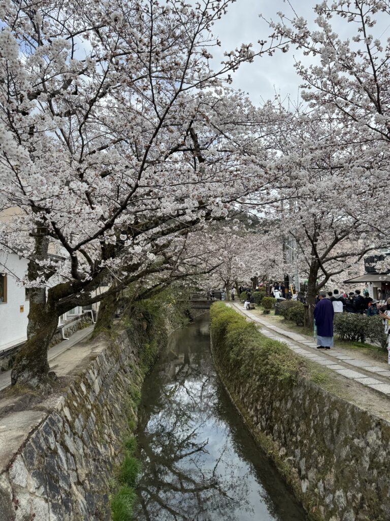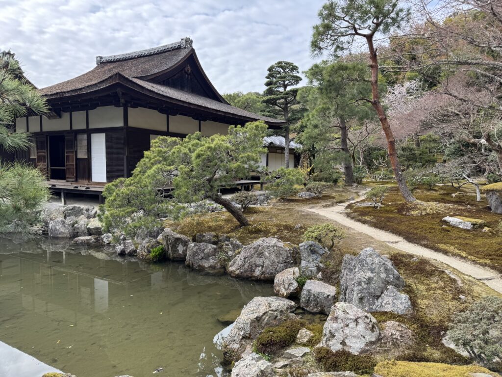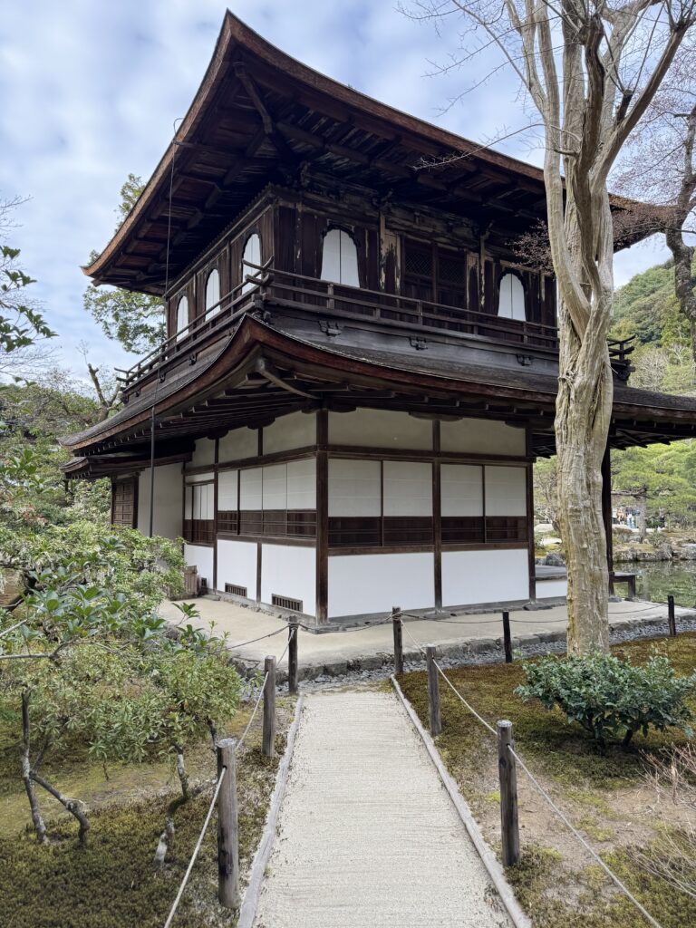 Im Anschluss bin ich dann weiter zur anderen Seite der Stadt, wo das Gegenstück, der 銀閣寺 (Ginkakuji – zu Deutsch etwa „Silberpavillon Tempel“) wartet besichtigt zu werden. Nachdem ich den goldenen Pavillon zuerst gesehen hatte, war ich davon ausgegangen der silberne Pavillon sei tatsächlich Silber… dem war nicht so.w Aber auf dem Weg dort hin gibt es unzählige Kirschbäume, die alle in Blüte standen.
